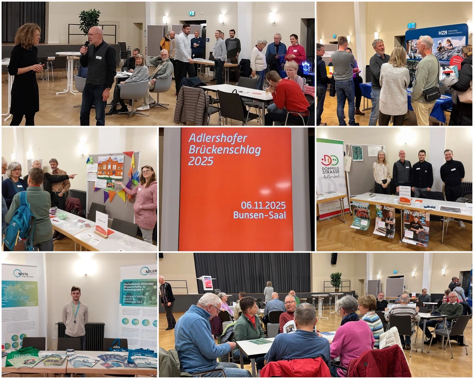 Auf der jährlich stattfindenden Informationsveranstaltung wird der Stand von aktuellen und geplanten Projekten auf beiden Seiten des Adlergestells vorgestellt. In diesem Jahr gab es erstmals ein „offenes Format” mit mehreren „Marktständen“ zu laufenden und geplanten Maßnahmen in Adlershof.