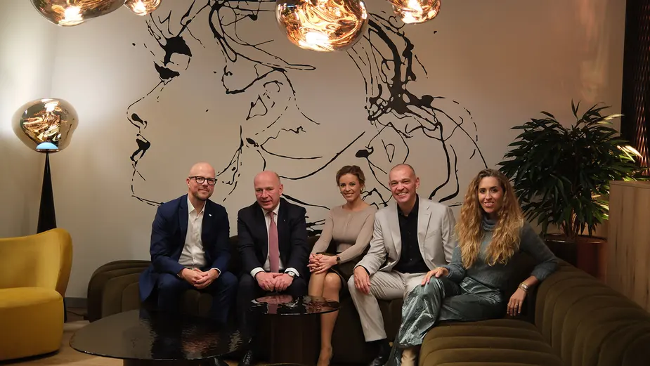 • v.l.n.r.: IHK-Präsident Sebastian Stietzel, Berlins Regierender Bürgermeister Kai Wegner, Designerin Urve Liivak, WISTA-Geschäftsführer Roland Sillmann und Künstlerin Sarah Masura